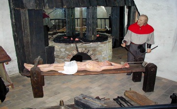 In den neu rekonstruierten Kellerräumen unter dem Rathaus am Hauptplatz Svornosti 1 in Český Krumlov befindet sich einzelne Exposition der Tortur und Folteranlage.