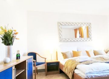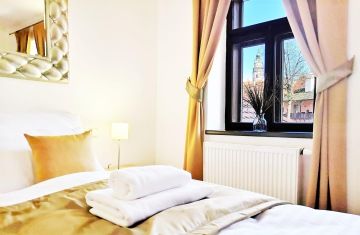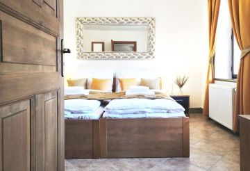 This spacious ground-floor suite for up to 4 guests offers a truly exceptional view of the town, the river, and the castle. It features a fully equipped kitchenette, a double bed, and a sofa bed.